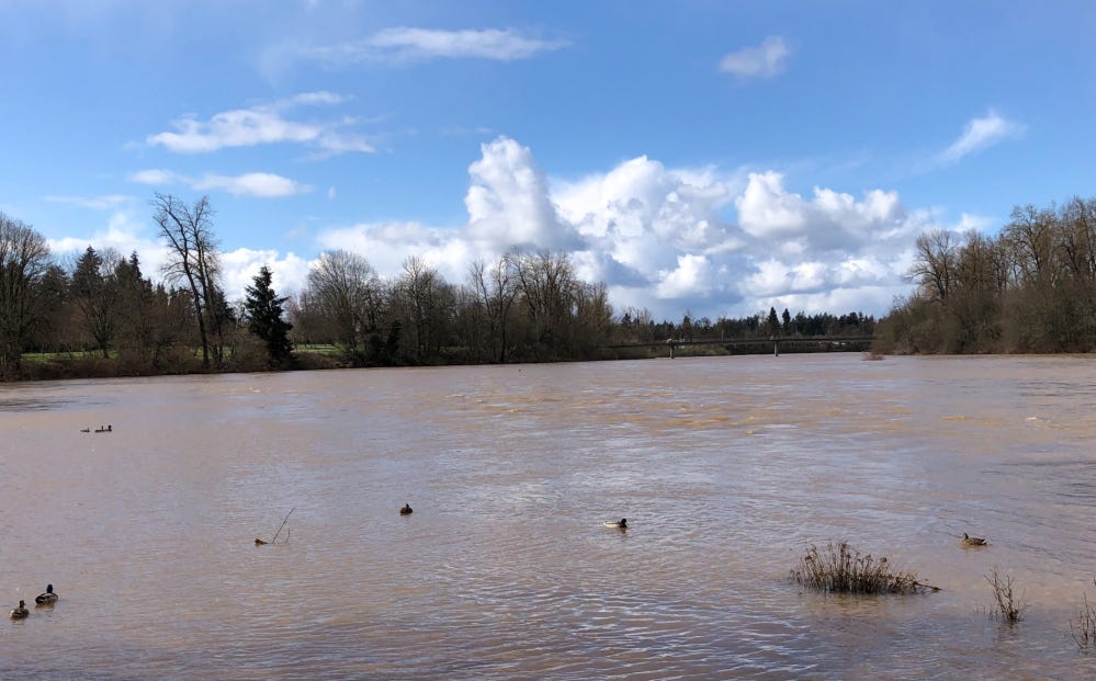 The river was muddy. And flowing quite rapidly. And almost overflowing the banks.